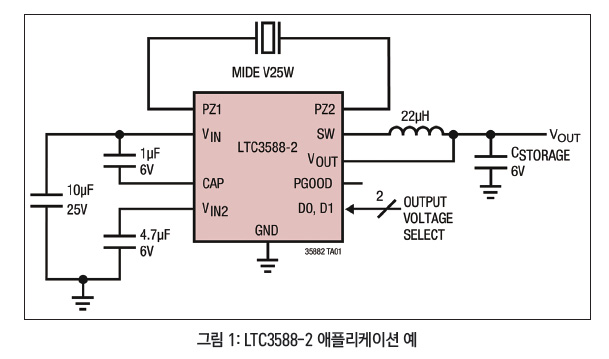 아나로그디바이스(Analog Devices)의 LTC3588-2는 저손실 전파 브리지 정류기와 고효율 벅 컨버터를 통합했다. 그러므로 압전, 전기기계, 태양광 전지, 자기 트랜스듀서를 비롯한 모든 다양한 에너지원으로부터 에너지를 하베스트하기 위해서 적합한 포괄적인 에너지 하베스팅 솔루션을 제공한다. 저전압 록아웃(UVLO) 모드일 때 830nA의 극히 낮은 입력 정지 전류를 소모하고, 16V의 상승 임계값은 효율적으로 에너지를 추출한다.