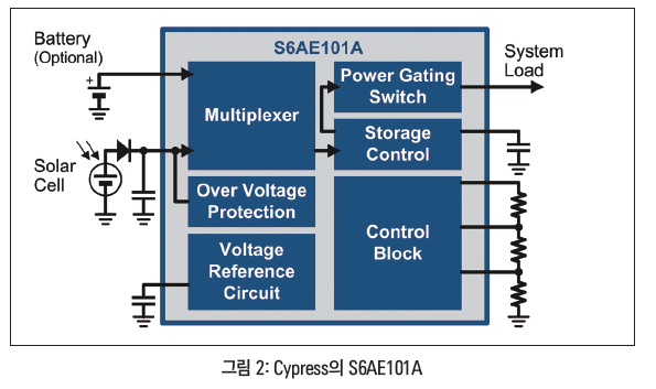Cypress의 S6AE101A 에너지 하베스팅 PMIC는 작게는 1㎠에 이르는 PV 전지를 사용하는 극소형 태양광 구동 무선 센서에 사용하기에 적합하다. 입력 전압 범위는 2V~5.5V이고, 출력 전압은 1.1V부터 5.2V 사이로 구성할 수 있다. 이들 PMIC 제품은 스위치 제어를 사용해서 태양광 전지가 발생시킨 전력을 출력 커패시터로 저장한다. 태양광 전지 입력 핀으로 과전압 보호 기능을 내장하고 있다.
