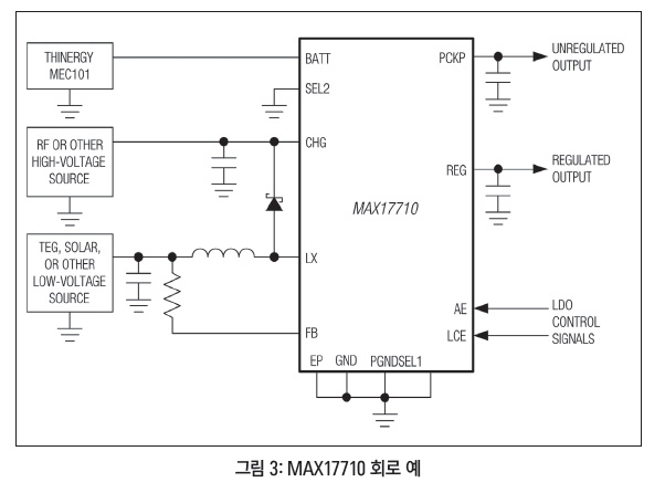 Maxim Integrated의 MAX17710 에너지 하베스팅 차저 겸 보호 디바이스는 출력이 1μW부터 100mW까지 이르는 주변 에너지 하베스팅 용으로 모든 필요한 전원 관리 기능을 통합했다. 리튬 차저는 1nA 대기 IQBATT, 625nA의 선형적 충전, 1μW 부스트 충전을 특징으로 한다. 3mm × 3mm × 0.5mm UTDFN 패키지로 제공되며, 1.8V, 2.3V, 3.3V LDO 전압을 지원한다. 부스터 레귤레이터 회로는 낮게는 0.75V(정격)에 이르는 소스로 충전하는 것을 가능하게 한다.