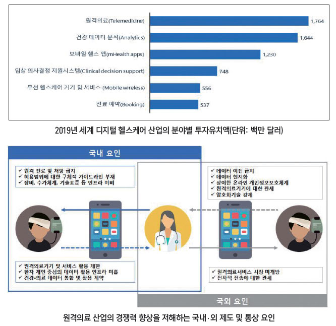 이러한 고속성장의 배경에는 아이러니하게도 코로나19의 대유행이 있었다. 전염병 펜데믹은 헬스케어 산업의 디지털 전환이 심화되면서 그 성장 속도는 더욱 가속화되었다. 특히 원격의료 분야에 대한 수요가 급증하고 있어 우리 산업계가 주목하고 있다. 국내에서는 전면적인 원격의료가 불법으로 간주되기 때문이다. 최근 코로나19 사태에 대응하기 위해 전화상담, 처방 등이 한시적으로 허용되었으나 진료 안전성, 수납방법 등에 대한 모호한 지침 등 관련 규제 및 인프라의 부재가 여실히 드러났다. 코로나19를 계기로 앞으로 비대면 의료에 대한 수요가 더욱 증가할 것으로 보여 관련 산업 활성화의 필요성이 더욱 부각되고 있다.