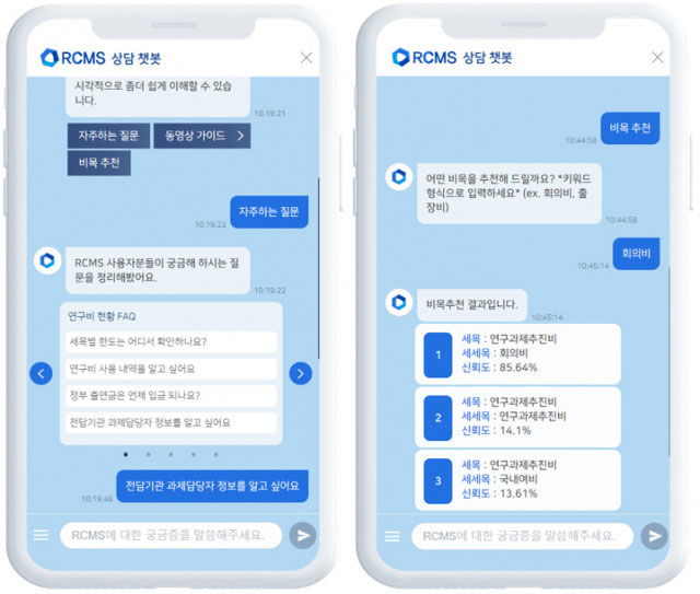한국산업기술평가관리원이 주관한 ‘AI, 빅데이터를 활용한 지능형 RCMS 개선 사업’은 그동안 쌓은 데이터에 AI 기술을 적용해 RCMS가 더욱 편리하고 활용도 높은 플랫폼으로 성장하는 계기가 됐다. 사용자의 올바른 연구비 사용을 목표로 △24시간 무중단 고객 응대를 위한 챗봇 서비스 △편리한 연구비 사용을 위한 비목 추천 서비스 △부정적 연구비 사용 예방을 위한 탐지모형을 제공해 기존 RCMS사용자와 담당자의 불편 사항을 해소한 것이 이 사업의 특징이다.