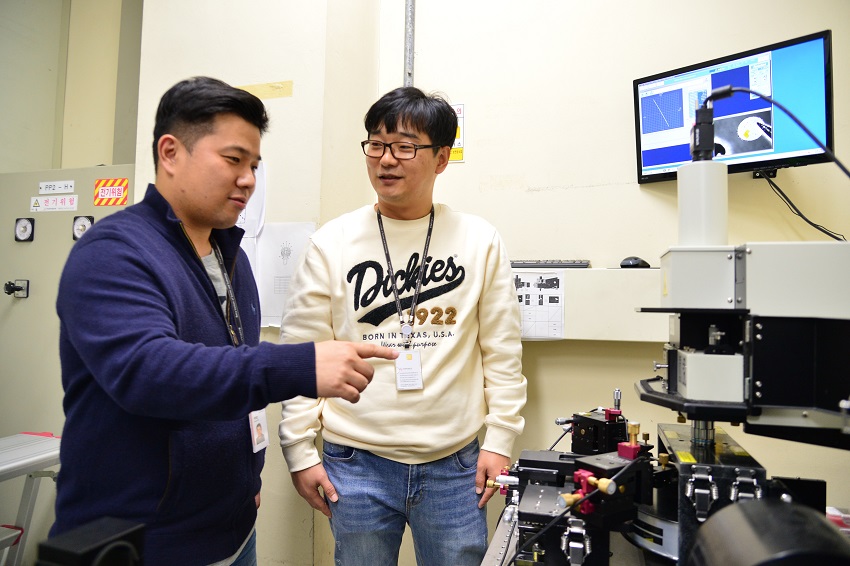 KIST 스핀융합연구단 박태언 박사(좌)와 KIST 광전소재연구단 주현수 박사가 연구내용을 협의하고 있다.