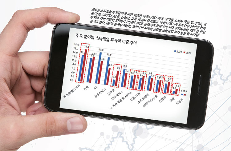 글로벌 스타트업 투자금액에 따른 비중은 바이오/헬스케어, 모바일, 소비자 제품 및 서비스, 교통/차량, 이커머스/유통, 산업재, 교육 등에서 증가했다. 바이오/헬스케어의 경우 2019년 전체 투자액 대비 비중이 3위에서 2020년 1위로 올라서며 코로나19 시대 투자자들의 가장 큰 관심을 유도했다. (출처: 한국무역협회, 코로나19 시대의 글로벌 스타트업 투자 동향 및 시사점)