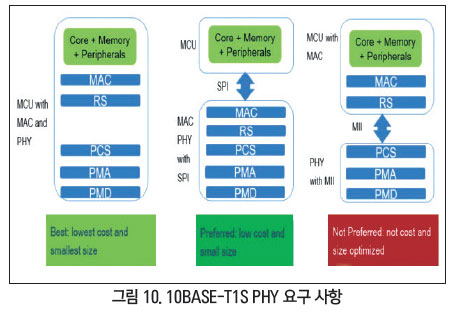 옵션 2는 MAC 및 RS가 통합 된 SPI 인터페이스가 있는 PHY이다. 이것은 SPI 인터페이스가 있는 MCU만 필요하다. 이것은 SPI 인터페이스가 있는 MCU가 훨씬 더 저렴하고 제한된 캐비닛 내 장치를 위한 대상 MCU이기 때문에 선호되는 옵션이다. 개방 얼라이언스[Open Alliance]와 같은 일부 표준조직은 10BASE-T1S PHY에 대한 SPI 인터페이스 표준화 작업을 하고 있으며 우리는 이를 반도체 분야에서 배웠다. SPI PHY는 2020년에 출시될 예정이다.