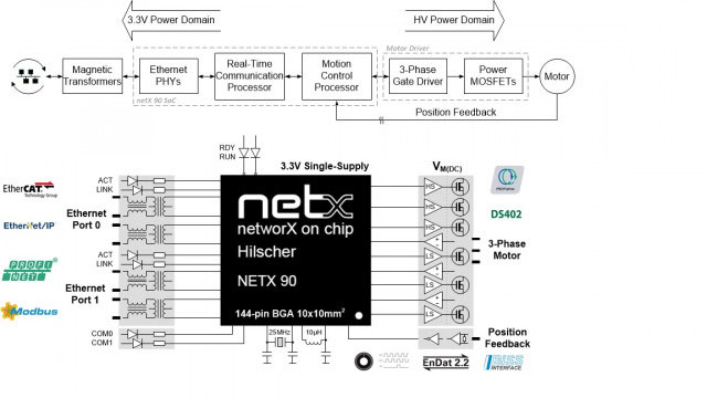 펌웨어 구성 솔루션으로 여러 실시간 네트워크 프로토콜을 지원하는 힐셔의 오랜 전략은 새로운 넷모션 솔루션을 통해 모션 제어 영역까지 확장됐다. 일반적으로 모션 및 모터 제어 시스템을 위한 칩 솔루션은 실시간 이더넷 연결을 지원하지 않는 경우가 많지만 힐셔의 netX 90 멀티 프로토콜 네트워크 칩은 넷모션을 이용해 산업용 통신과 다목적 모션 제어 기능을 단일 칩에 통합할 수 있다.