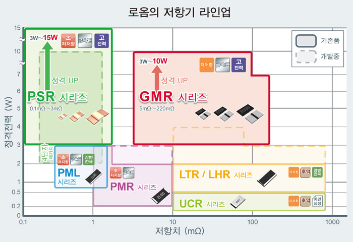 <고전력 · 초저 저항 션트 저항기 PSR 시리즈 제품 라인업>