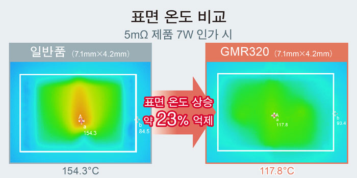션트 저항기는 고전력 환경에서 사용하는 경우, 제품의 표면 온도 상승 억제에 대한 과제가 있다. 신제품은 재료의 개선과 독자적인 구조를 채용함으로써 방열성을 높여, 표면 온도 상승을 대폭 억제했다. 예를 들어 5mΩ 제품을 7W로 사용할 때, 일반품이 154.3℃에 달하는 반면, 신제품은 117.8℃로 표면 온도 상승을 23% 억제했다.