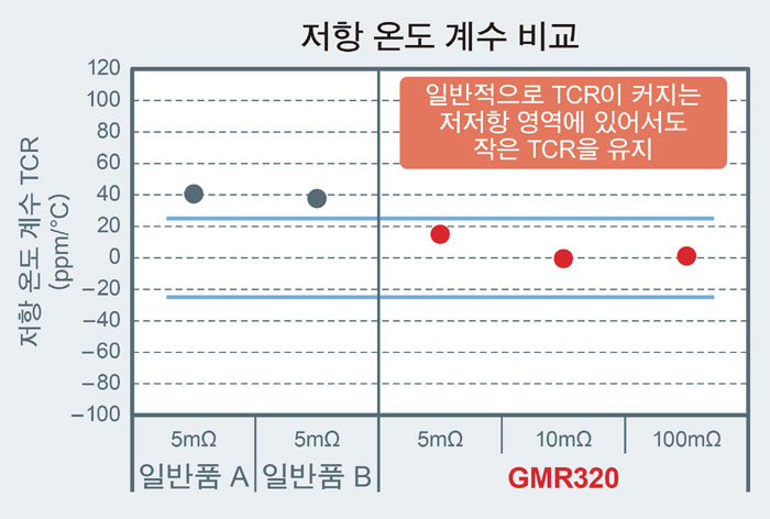 일반적으로, 저항치가 낮아질수록 저항 온도 계수 (TCR)는 커지지만, 신제품은 저항체 금속에 고기능 합금 재료를 채용함으로써, 저저항 영역에서도 ±25ppm/℃ 이하라는 우수한 저항 온도 계수 (TCR)를 달성했다. 저저항 영역에서도 일반품에 비해 열로 인한 저항치 변화를 1/2 정도로 저감하여, 고정밀도 전류 검출이 가능하므로 어플리케이션의 신뢰성 향상에 기여한다.