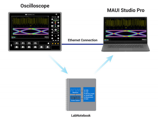 다른 위치의 엔지니어는 서로 협력하며 이전 엔지니어링에서의 통찰력을 바탕으로 디버그 및 검증을 가속할 수 있다. 또한 데이터가 텔레다인르크로이의 랩노트북 파일을 통해 저장 및 공유되면 사용자 PC의 MAUI Studio Pro 내에서 오실로스코프의 디버그 및 분석 소프트웨어 옵션이 활성화된다. 따라서 PC 기반 MAUI Studio Pro를 위한 추가 소프트웨어 옵션 제품군을 구매할 필요가 없다.