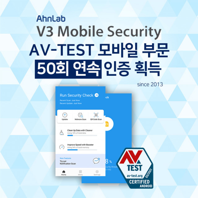안랩(대표 강석균)의 안드로이드 스마트폰용 무료 보안 솔루션 ‘V3 모바일 시큐리티(AhnLab V3 Mobile Security)’가 글로벌 보안제품 성능 평가기관 ‘AV-TEST’의 모바일 보안제품 성능 평가에서 ‘50회 연속 인증 획득’을 달성했다고 밝혔다.