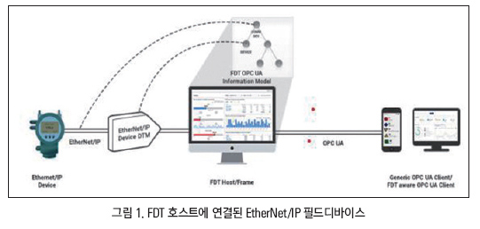 그림 1과 같이 EtherNet/IP 필드디바이스는 FDT 호스트/프레임 애플리케이션에서 EtherNet/IP장치 DTM을 나타낸다. FDT 호스트 애플리케이션은 FDT OPC UA 정보 모델을 노출하고 OPC UA 서비스를 통해 EtherNet/IP장치 객체에 액세스할 수 있도록 한다. 일반 또는 FDT인식 OPC UA 클라이언트는 FDT OPC UA 서버에 연결하여 EtherNet/IP장치에 액세스할 수가 있다. 아래 나열된 FDT OPC UA 정보 모델에서 EtherNet/IP 필드 장치를 지원하는 데 필요한 구성요소는,