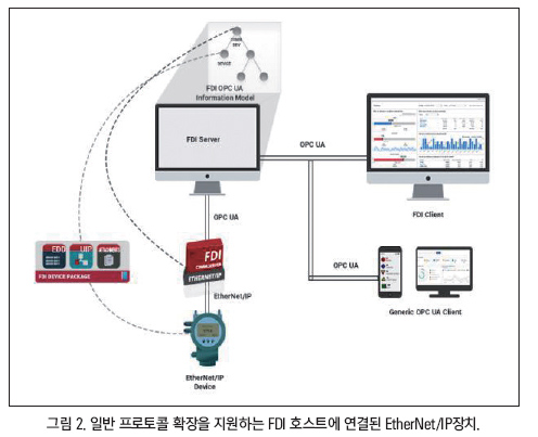 아래의 그림 2와 같이 EtherNet/IP FDI 장치 패키지는 FDI 호스트 시스템의 EtherNet/IP장치를 나타낸다. FDI 서버는 다음을 사용하여 이더넷/IP장치와 통신한다. EtherNet/IP FDI 통신서버 FDI 정보모델에서 EtherNet/IP장치 객체를 표시한다. 모든 일반 OPC UA 클라이언트 또는 FDI 클라이언트 애플리케이션은 FDI 서버(OPC UA 서버)에 연결하여 EtherNet/IP 디바이스에 액세스할 수 있다.