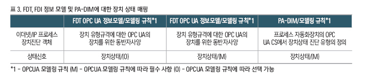 표 4에서 FDT OPC UA 정보 모델 FDI 정보 모델 및 PA-DIM에 대한 모니터링 프로세스 가변 사용사례 지원에 대해 매핑하고 비교했다.