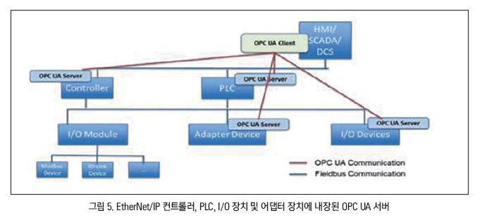 OPC 지원 호스트 시스템에서 정보를 가져오는 것 외에도, OPC UA를 EtherNet/IP 어댑터장치, 드라이브, PLC 및 컨트롤러에 포함할 수 있다. 이를 통해 EtherNet/IP 장치와 MES, 진단용 시각화 도구, 자산 모니터링, 구성 사용사례와 같은 상위수준 시스템 간의 수직적 통신이 가능하다. 그림 5는 EtherNet/IP 컨트롤러, 어댑터 장치, PLC 및 I/O 장치에 내장된 OPC UA 서버를 보여준다.