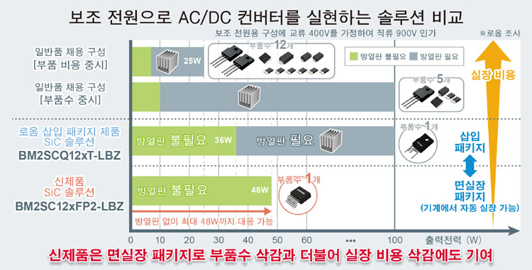 기존에는 실현이 불가능했던 기판에 대한 자동 실장이 가능해짐과 동시에, 교류 400V, 48W 출력까지의 보조 전원에 채용하는 경우 일반품을 채용한 구성에 비해 극적인 부품수 삭감 (12개 제품과 방열판을 1개의 제품으로 대체)을 실현함으로써 부품 고장 리스크도 저감되었으며, SiC MOSFET를 통해 최대 5%의 전력 고효율화를 달성했다. 이에 따라, 공정에서의 실장 비용을 대폭 삭감할 수 있어, 극적인 소형/고신뢰성/저전력 솔루션을 제공할 수 있다.