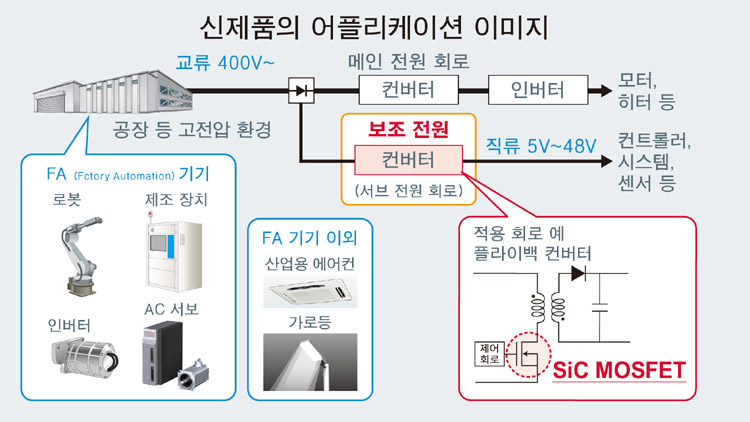 최근 에너지 절약에 대한 의식이 높아짐에 따라, 교류 400V를 취급하는 산업기기에 있어서, 고전압 대응, 저전력화, 소형화가 가능한 SiC 파워 반도체의 채용이 추진되고 있다. 반면에 산업기기에는 메인 전원 회로와 더불어 각종 제어 시스템에 전원전압을 공급하는 보조 전원이 내장되어 있으며, 설계 공수의 관점에서 이러한 보조 전원에는 내압이 낮은 Si-MOSFET 및 손실이 큰 IGBT가 여전히 널리 채용되고 있어, 저전력화에 있어서 큰 과제였다.