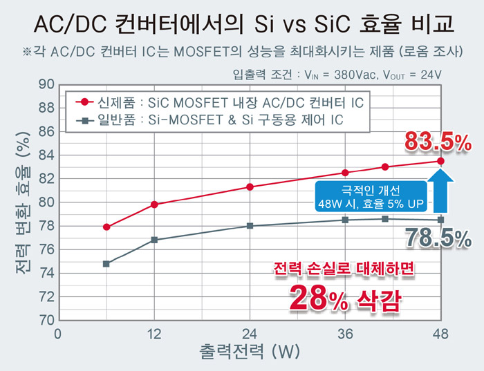 1패키지화를 통해, 일반적인 Si-MOSFET를 채용한 디스크리트 부품 구성에 비해 최대 12개의 제품 (AC/DC 컨버터 제어 IC, 800V 내압 Si-MOSFET×2, 제너 다이오드×3, 저항기×6)과 방열판을 하나의 제품으로 대체하여 극적인 부품수 삭감을 실현했다. 또한, SiC MOSFET는 고내압으로 고전압 노이즈에 강하므로, 노이즈 대책 부품도 소형화할 수 있다.