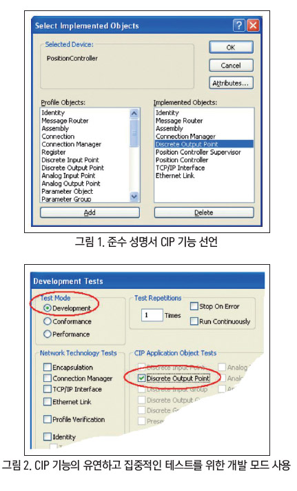 적합성 테스트 소프트웨어는 적합성 및 개발 모드를 제공한다. 개발 모드에서는 개별 테스트 또는 일련의 테스트를 선택할 수 있다. 이를 통해 장치개발의 현재 단계에 관련된 특정 CIP 네트워크 사양의 측면에 집중할 수가 있다.
