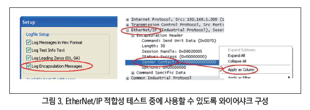 ODVA 소프트웨어와 결합된 와이어샤크는 강력한 EtherNet/IP 개발 도구이다. 이 조합을 이용하려면 EtherNet/IP 발신인 문맥[Sender Context]의 필드를 사용하여 와이어샤크 캡처를 적합성 테스트 로그와 정렬해야 한다.