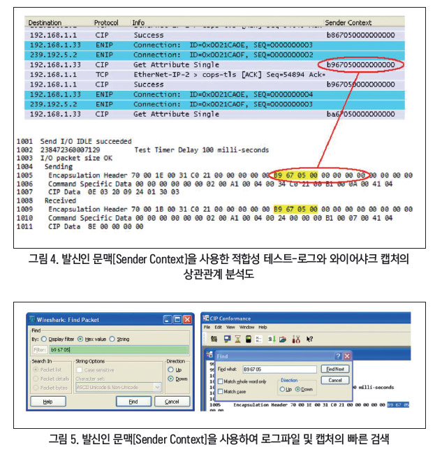 이렇게 하려면 먼저 적합성 테스트 소프트웨어(설정 대화 상자)에서 캡슐화 로깅을 사용하도록 설정해야만 한다. 와이어샤크에서 발신인 컨텍스트를 열로 선택한다. 적합성 테스트 로그 항목을 와이어샤크 캡처와 연관시키려면 표시된 보낸 사람 컨텍스트를 일치시킨다.