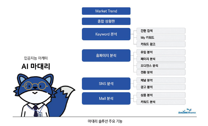 데이터를 기반으로 디지털 마케팅을 진단해 의사결정을 도와주는 데이터 마케팅 인공지능 솔루션 ‘마대리(www.maderi.co.kr)’가 대표적이다.