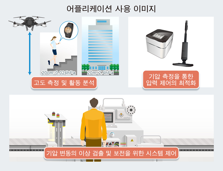 기압 센서는 스마트폰 및 웨어러블 기기 등에 있어서, 실내 네비게이션 및 활동량계의 고저차 데이터를 취득하기 위해 보급되어 왔다. 최근에는 용도가 확대됨에 따라 방수 성능과, 소형, 그리고 외적 변화의 영향에 강한 기압 센서가 요구되고 있다.