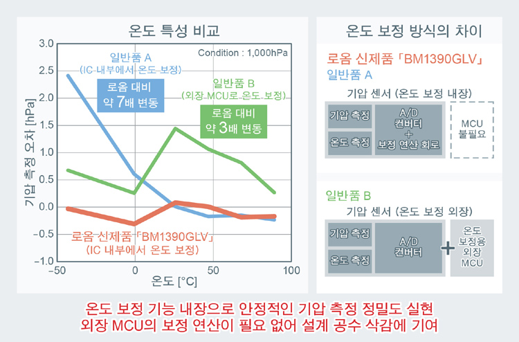 BM1390GLV는 독자적인 알고리즘에 의한 온도 보정 기능을 내장했다. 일반품에 비해 온도에 따른 기압 측정 오차가 적어 안정적인 기압 측정을 실현함으로써, 일반품에서는 탑재가 어려운 열원 주변에 탑재가 가능하다. 또한, 외장 MCU (마이컴)의 보정 연산이 필요 없어, 설계 공수 삭감에 기여한다.
