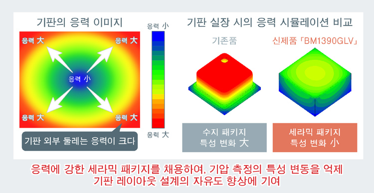 기존품에서 사용되는 수지 패키지의 경우, 기판 실장 시 응력으로 인해 특성 변동이 발생하게 된다. BM1390GLV는 세라믹 패키지를 채용함으로써, 응력의 영향으로 인한 특성 변동을 억제했다. 수지 패키지 제품에 필요한 기압 센서의 배치 제약을 배제함으로써 기판 레이아웃의 설계 자유도 향상에 기여한다.