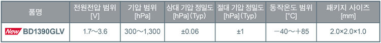 또한, 독자적인 온도 보정 기능으로 우수한 온도 특성을 실현했고, 세라믹 패키지를 채용함으로써 기판 실장 시 응력으로 인한 특성 변동을 억제했다. 이러한 특징으로, 기존품으로는 대응이 어려웠던 방수 성능이 필요한 어플리케이션 및 온도 변화가 큰 환경에서도 고정밀도의 기압 측정을 실현할 수 있다.