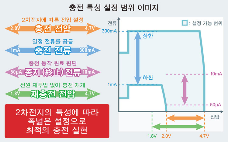 이 제품은 IC 내부의 회로 안정성을 높임으로써 2.0V에서 4.7V까지의 폭넓은 충전 전압 범위를 실현하여, 리튬 이온 배터리 등 기존의 2차전지뿐만 아니라, 최근 개발이 추진되는 전고체 반고체 등 저전압 충전을 필요로 하는 신형 2차전지의 충전에도 대응한다.