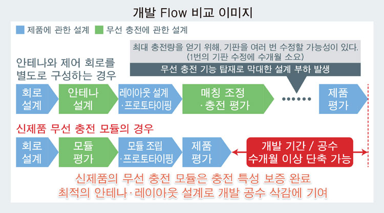 또한, 무선 충전 기능은 안테나 형상 • 사이즈 • 거리에 따라 충전 효율이 달라지기 때문에, 실장을 위해서는 전자기기 측에서 프로토타입 제작 • 조정 • 평가 등을 반복하여 실시해야 한다. 따라서, 안테나 설계 • 레이아웃 설계에 있어서 매우 많은 개발 부하가 과제였다.