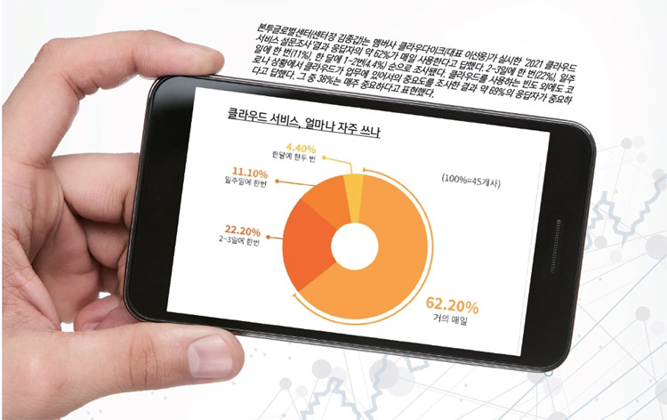 본투글로벌센터(센터장 김종갑)는 멤버사 클라우다이크(대표 이선웅)가 실시한 ‘2021 클라우드 서비스 설문조사’결과 응답자의 약 62%가 매일 사용한다고 답했다. 2~3일에 한 번(22%), 일주일에 한 번(11%), 한 달에 1~2번(4.4%) 순으로 조사됐다.