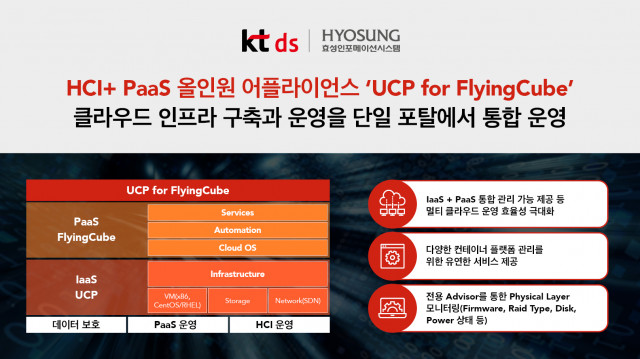 효성인포메이션시스템(대표이사 양정규)은 KT그룹의 IT 서비스 전문기업 KT DS(대표이사 우정민)와 함께 컨테이너 기반 어플라이언스 제품인 ‘UCP for FlyingCube’를 출시하고 PaaS 시장을 적극적으로 공략한다고 밝혔다.