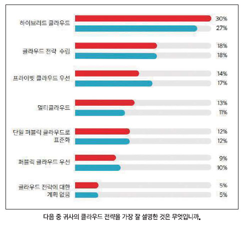 18%의 조직이 여전히 클라우드 전략을 수립하고 있지만 하이브리드 클라우드 접근 방식이 가장 일반적이다(30%). 하이브리드 클라우드는 여전히 전반적으로 가장 일반적인 클라우드 전략이다. 하이브리드 클라우드와 같은 의미로 많이 사용되는 용어인 멀티클라우드를 선택한 조직을 포함하면 클라우드를 두 가지 이상 활용하는 클라우드 전략을 채택한 기업은 43%로 지난해보다 5% 포인트나 증가했다.