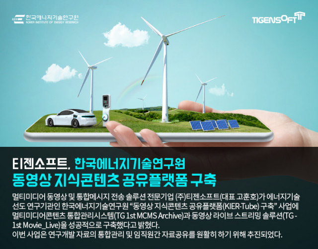 티젠소프트(대표 고훈호)가 한국에너지기술연구원의 ‘동영상 지식콘텐츠 공유플랫폼(KIER-Tube) 구축’ 사업에 멀티미디어 콘텐츠 통합 관리 시스템(TG 1st MCMS Archive)과 동영상 라이브 스트리밍 솔루션(TG 1st Movie_Live)을 성공적으로 구축했다고 11일 밝혔다.