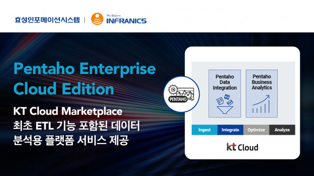 데이터 인프라 및 솔루션 전문 기업 효성인포메이션시스템(대표이사 양정규)이 KT 클라우드 마켓플레이스에 ‘펜타호(Pentaho)’를 입점해 클라우드 환경에서 손쉬운 데이터 분석을 지원하고 퍼블릭 클라우드로 타깃 시장을 확대한다고 밝혔다.