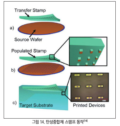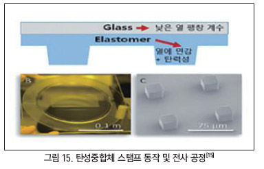 전사 공정을 위한 스탬프 구조는, 뒷면은 기계적 안정성을 고려하여 견고한 유리판이어야 하며, 앞면은 접착의 신뢰도를 주는 유연한 탄성중합체로 만든다. 상대적으로 큰 열 평창 계수(CTE, Coefficient Thermal Expansion)를 가지고 있어 온도 변화에 따른 팽창 및 수축이 쉽게 일어나 전사의 정확도에 영향을 준다.