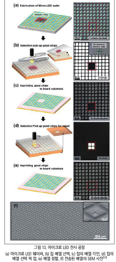 위의 두 가지 전사 공정 기술을 통하여, 대면적 디스플레이 및 유연 기판을 포함한 다양한 분야에 적용되고 있다. 하지만, 수많은 장점에도 불구하고, 마이크로 LED는 제조 공정비용이 비싸다는 단점이 있다. 현재, 제조 비용 절감 및 수율 향상을 통한 다양한 연구가 이뤄지고 있다.
