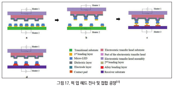 또 다른 기술은, 럭스뷰(LuxVue)에서 개발한 픽 업 헤드(pick-up-heads) 전사 공정이다. 마이크로 LED 칩을 특정 온도에서(80℃~160℃ 이내) 기판과의 결합력을 약하게 만들고, 헤드 전극에 실리콘 소재를 증착하여 발생하는 정전기력으로 LED 칩을 들어 올린다. 마이크로 LED 칩을 옮겨 붙인 후, 땜납 용융 처리 접합(reflow soldering) 기법을 통해 전사하는 기술이다.