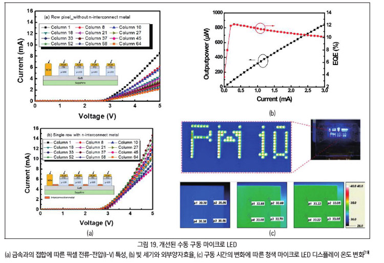 상호 연결에 따른 발광 효율, 접촉 저항을 낮추는 것, 청색광 효율에 대한 개선이 수동 구동 마이크로 LED의 핵심적인 목표 과제다.
