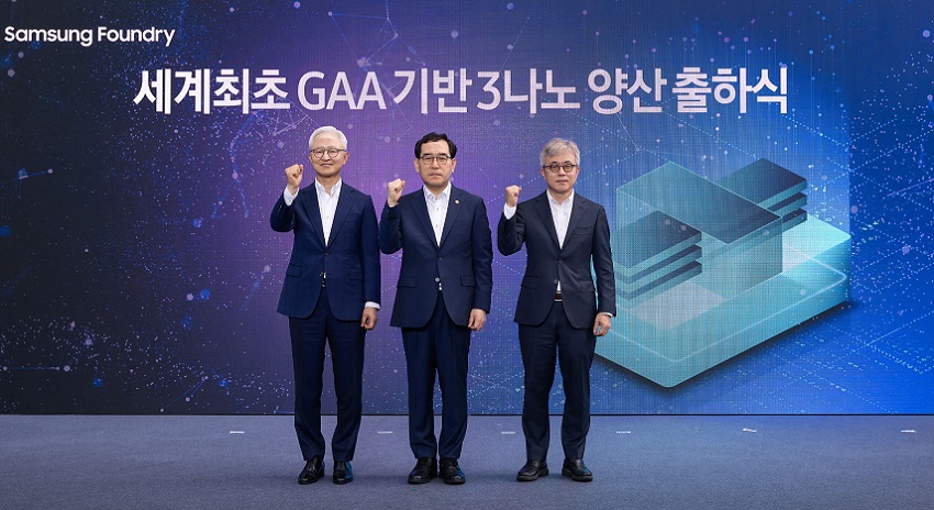 삼성전자가 25일 경기도 화성캠퍼스 V1라인(EUV 전용)에서 차세대 트랜지스터 GAA (Gate All Around) 기술을 적용한 3나노 파운드리 제품 출하식을 개최했다고 밝혔다.