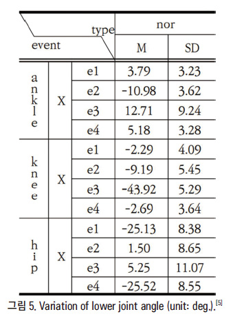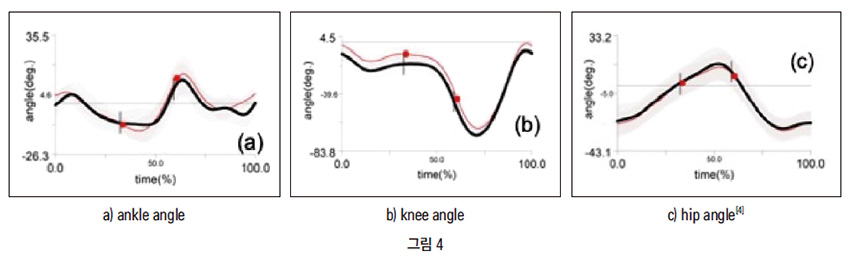 보행 패턴에 따른 각 관절의 각도변화를 나타내며, 그림 4의 그래프는 평범한(normal) 상태의 피험자의 결과값을 나타낸다. (정상적인 보행을 그래프로 측정, “ankle 각도”의 보행시, normal 값을 가지는 그래프) 해당 그래프는 인체를 모델링한 대상자별 3회 보행자료의 평균치를 나타내며, black line을 가지는 그래프의 수치가 normal data를 그리고 있다. red line의 수치는 insole 착용시를 나타내므로, black line의 normal data를 참고하였다.