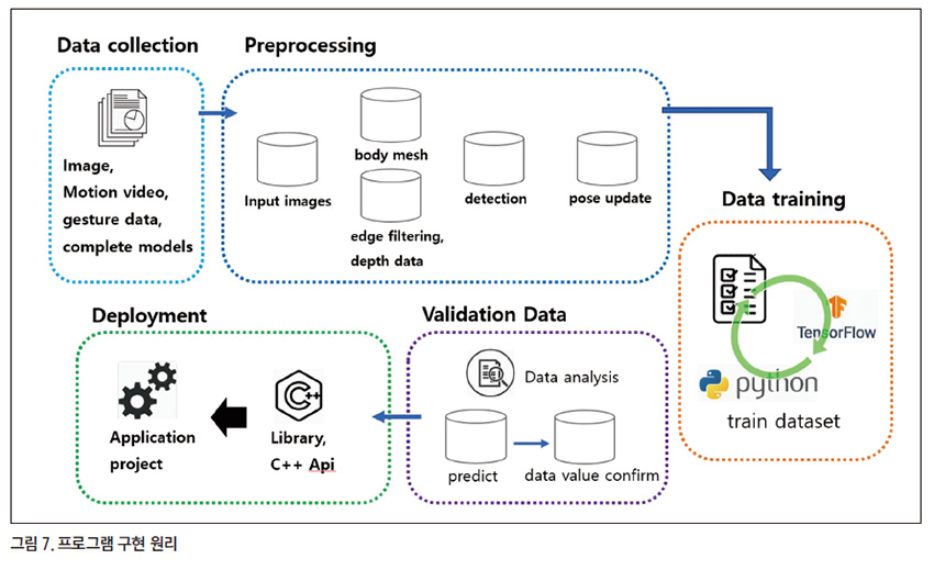 4. 평면화한 데이터를 neural network으로 전송한다. 그 후에 학습할 데이터를 training 시키고, 해당 데이터에 대한 유효성을 검증하는 작업을 하며, 이렇게 훈련된 모델을 이용하여 python 또는 C++ 형태로 된 library를 Application project에 적용시키는 방법으로 진행한다.