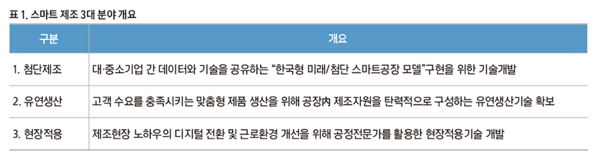 이를 위해, 올해부터 과기부와 부처간 협업을 통해 첨단제조, 유연생산, 현장적용 등 스마트 제조 3대 기술 분야의 공급기술 개발을 위해 2026년까지 총사업비 4,341억 원을 투입할 예정입니다. 또한, 과제에 참여중인 이종 기술의 공급 기업 간 기술협력과 융합, 사업화에 대한 소통의 장을 마련하고, 상호 벤치마 킹할 수 있도록 기술교류회를 정기적으로 개최할 계획입니다.
