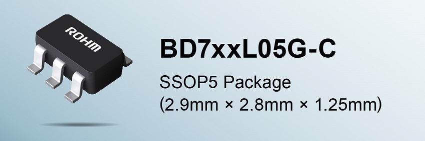 신제품(BD7xxL05G-C 시리즈: BD725L05G-C, BD730L05G-C, BD733L05G-C, BD750L05G-C)은 소형 사이즈 (2.9mm×2.8mm)와 동시에 고내압 (Max.=45V)과 저소비전류 (Typ.=6μA)를 실현하여, 상시 구동이 요구되는 서브 전원 구축 시의 주요 요구 사양에 대응한다.