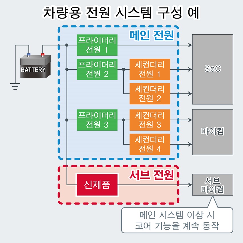최근, ADAS(첨단 운전자 지원 시스템)의 진화 등에 따라, 이러한 어플리케이션에 전력을 공급하는 차량용 전원 시스템에도 고신뢰성이 요구되고 있다. 이에 따라, 메인 시스템에 이상 상태가 발생한 경우에도, 어플리케이션의 코어 기능 (서브 마이컴)을 지속적으로 동작시킬 수 있는 서브 전원을 차량용 전원 시스템에 탑재하는 경우가 증가하고 있다.