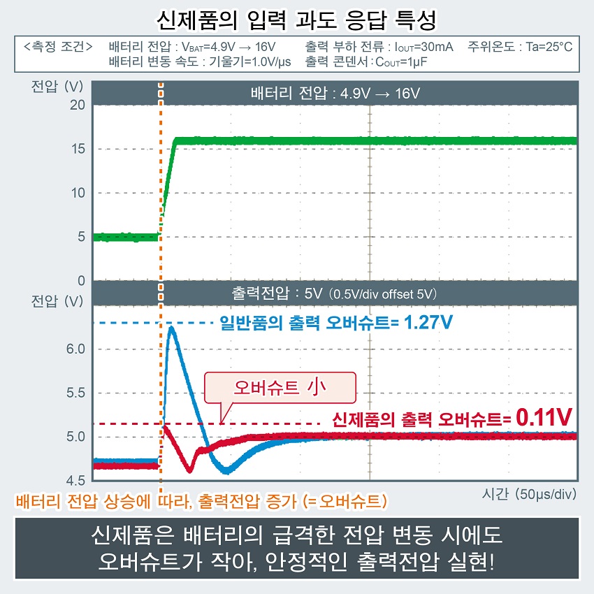 또한, 로옴의 강점인 아날로그 제어 기술을 통해 배터리의 급격한 전압 변동 시에도 안정적인 출력전압을 실현한다. 동일 조건으로 비교하는 경우, 일반품은 최대 1.2V를 초과하는 오버슈트가 발생하므로 서브 마이컴 등 후단 디바이스의 정격전압을 초과하지 않도록 대용량의 출력 콘덴서가 필요하지만, 신제품은 오버슈트가 0.1V 정도이므로 출력 콘덴서의 소형화가 가능하다.