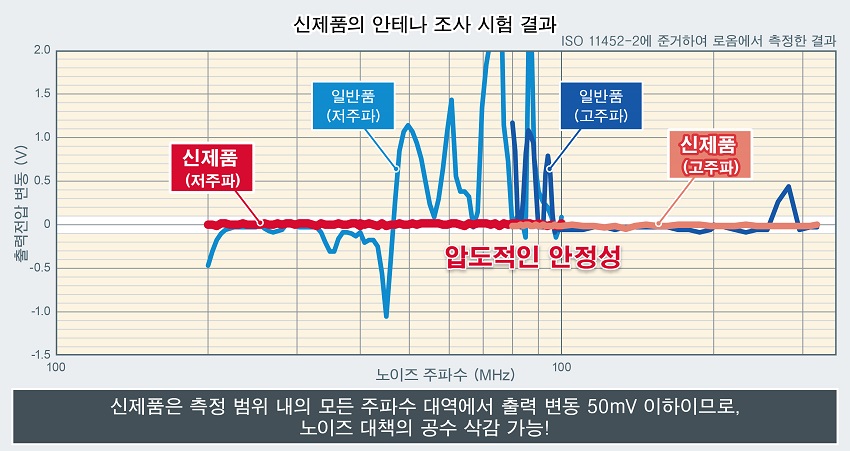 그리고, 외부 노이즈에 대한 내성이 높아, ISO 11452-2의 안테나 조사 시험 (노이즈 내성의 국제 표준 규격)에서 측정 범위 내의 모든 주파수 대역에서 출력전압 변동량을 50mV 이하 (±1% 이하)로 억제할 수 있어, 노이즈 대책의 공수도 삭감할 수 있다.