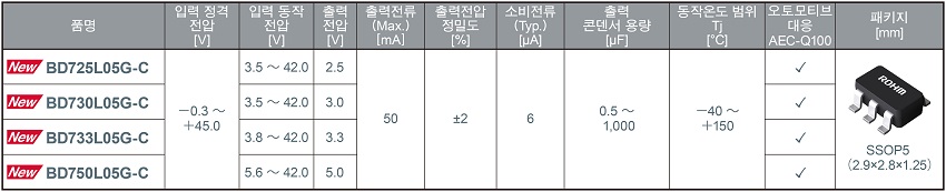 신제품 「BD7xxL05G-C 시리즈」는 차량용 제품에 요구되는 125℃ 동작 및 자동차기기 신뢰성 규격 「AEC-Q100」 준거, 차량용 서브 전원에 요구되는 소형 패키지 사이즈 및 저소비전류 등 기본 요구 사양을 만족한 제품이다. 또한, 소형과 동시에 프라이머리 전원 (입력 정격전압 : 45V)으로 사용이 가능하여, 각종 마이컴 및 센서 등, 후단 디바이스에 따라 선택 가능한 제품 라인업을 전개하고 있다.