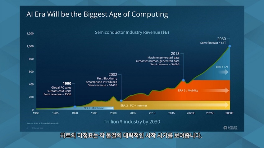 반도체 산업은 4번의 컴퓨팅 물결과 함께 성장했으며 각 물결은 이전보다 거의 두 배에 달하는 매출 성장을 이끌었다. 메인프레임 컴퓨팅에서 PC와 모빌리티에 이르기까지 우리는 이제 수천억 개 디바이스가 연결된 AI 시대에 살고 있다.